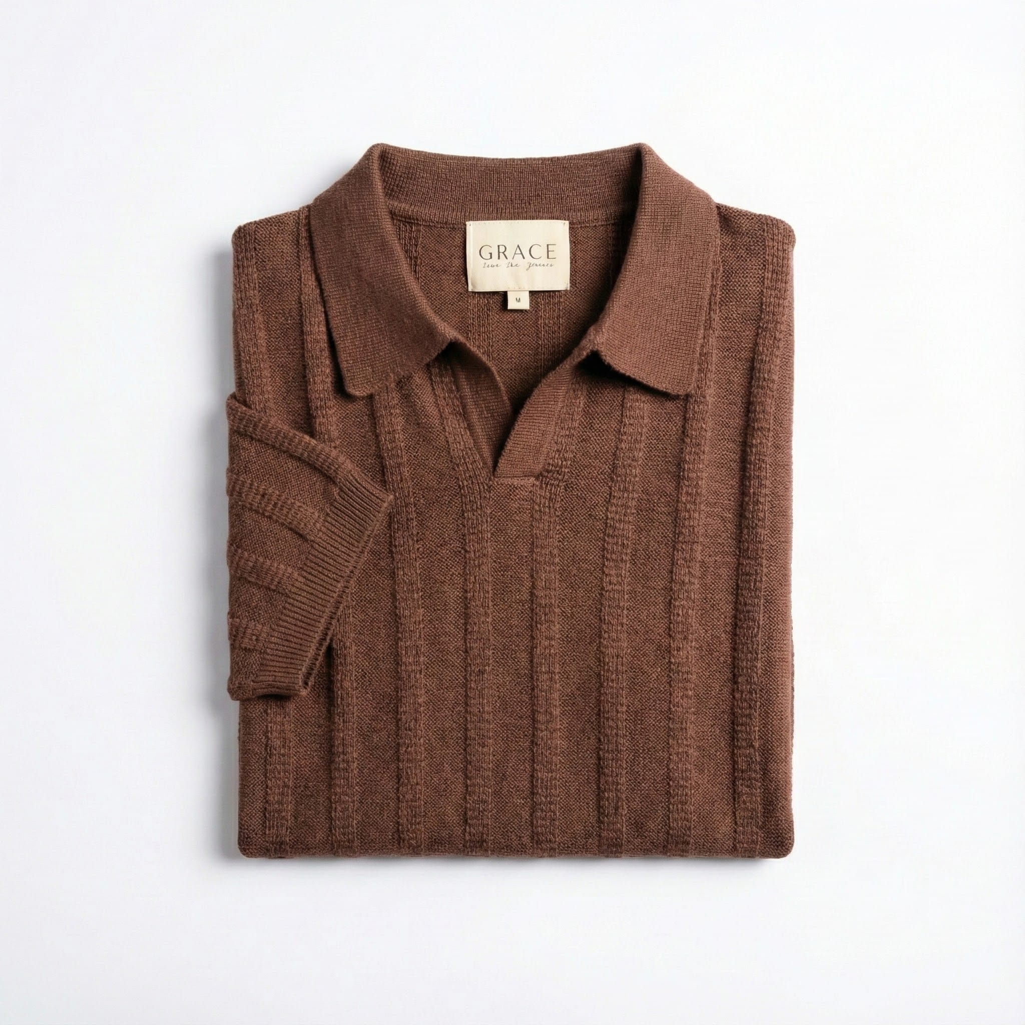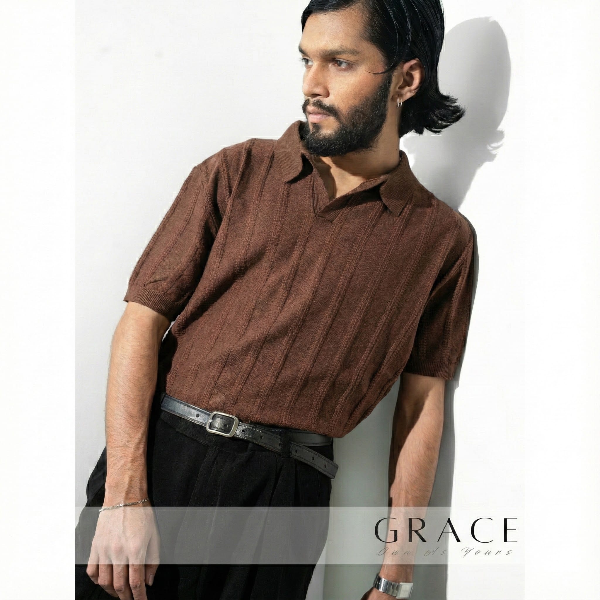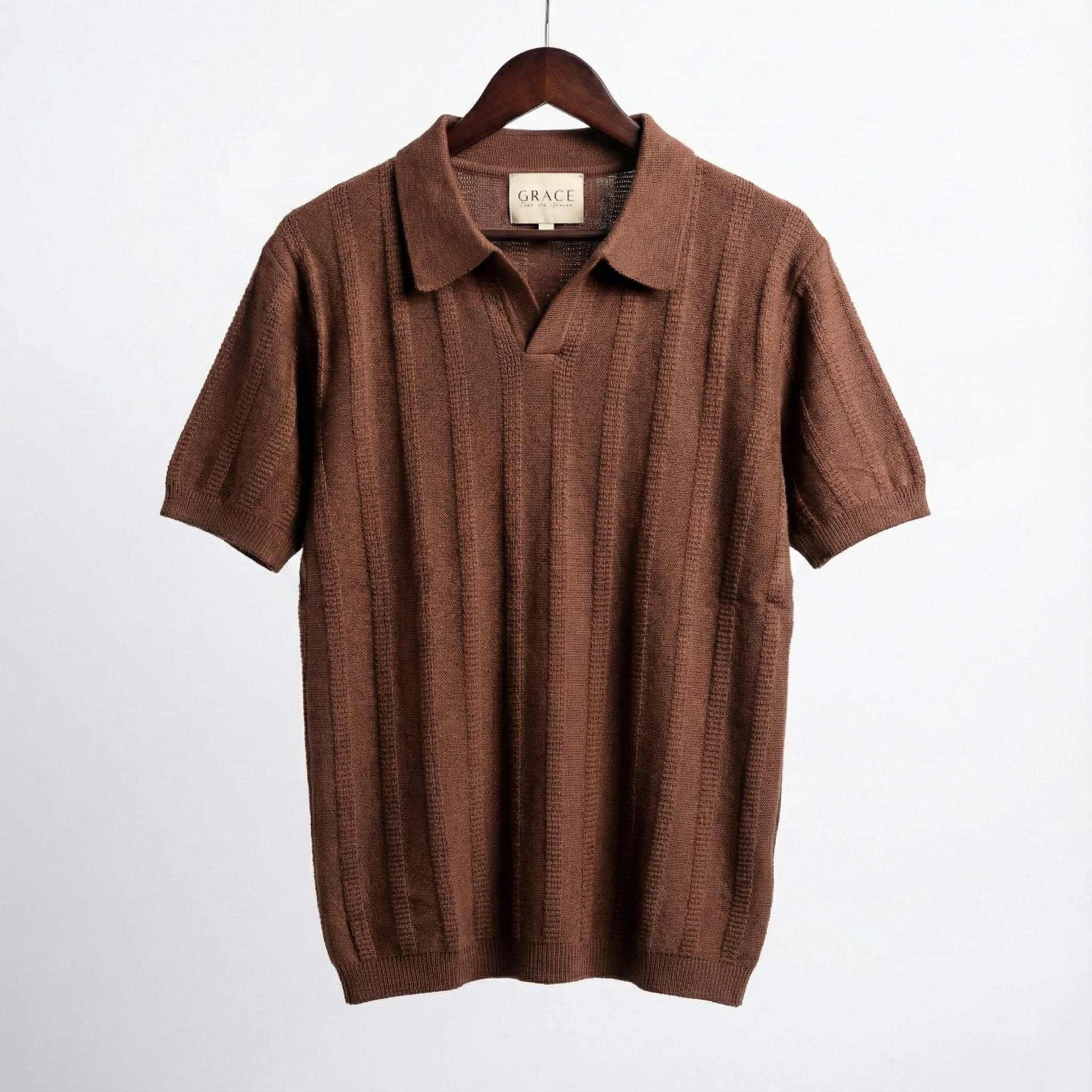 The Mocha Brown Stripe Knit Polo By GRACE elevates the standard black tee into a piece of formal knitwear. Built with 350g CVC blended yarn, it provides the perfect balance of softness and durability for the modern professional.