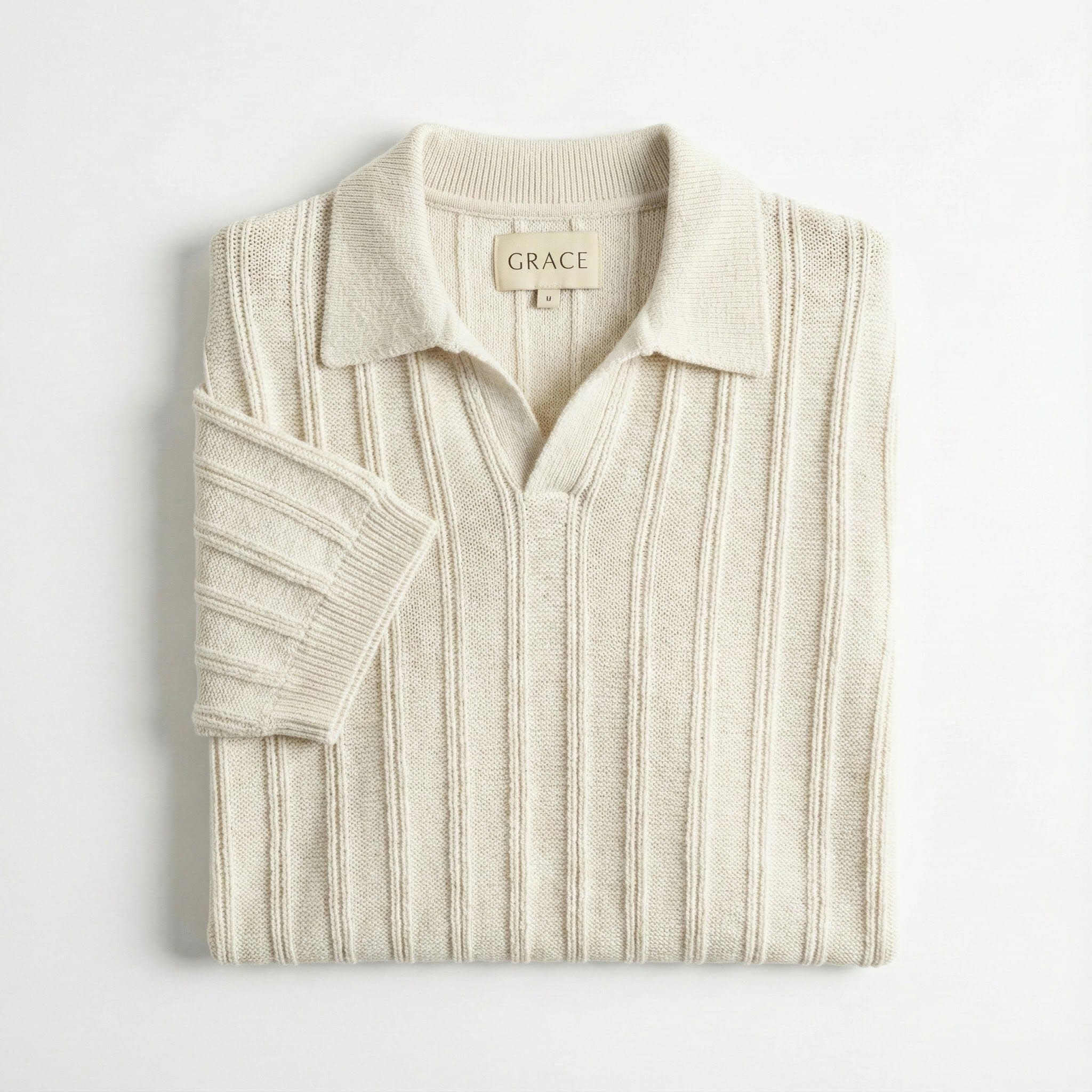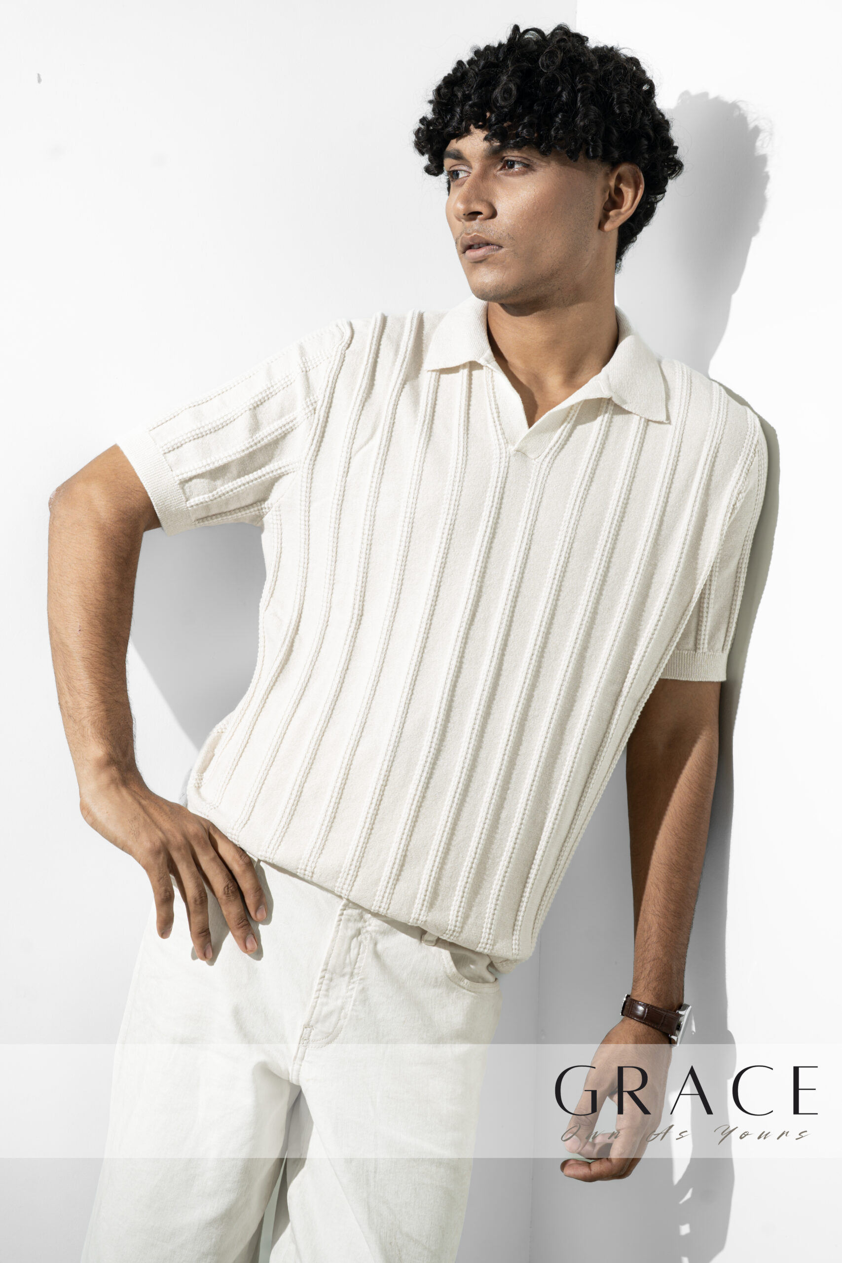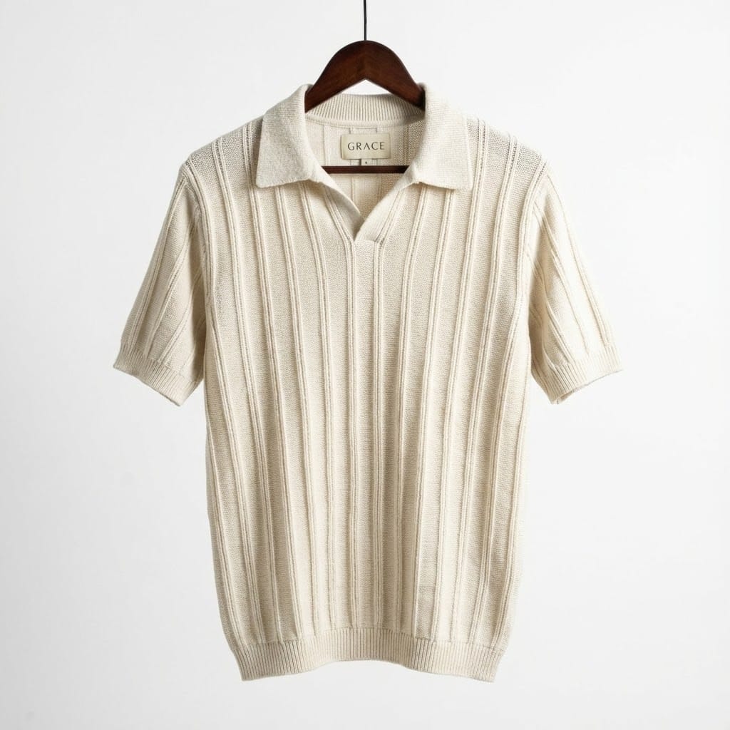 The Ivory White Stripe Knit Polo By GRACE elevates the standard black tee into a piece of formal knitwear. Built with 350g CVC blended yarn, it provides the perfect balance of softness and durability for the modern professional.